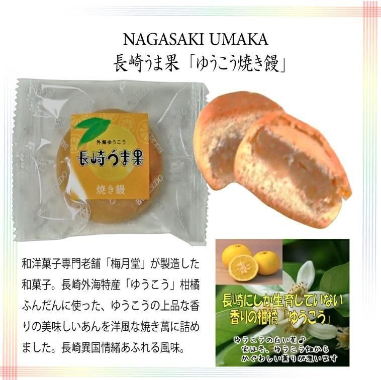 商品名:長崎うま果/焼き饅 約30g 名称:和菓子 原材料名:白あん(生餡、砂糖)(国内製造)、小麦粉、卵、ゆうこう果汁、砂糖、ゆうこう果皮、マーガリン、バター、加糖れん乳、水あめ、食用綿実油、はちみつ入り液糖/甘味料(ソルビトール)、膨張剤、トレハロース、香料、(一部に小麦・卵・乳成分・大豆を含む)