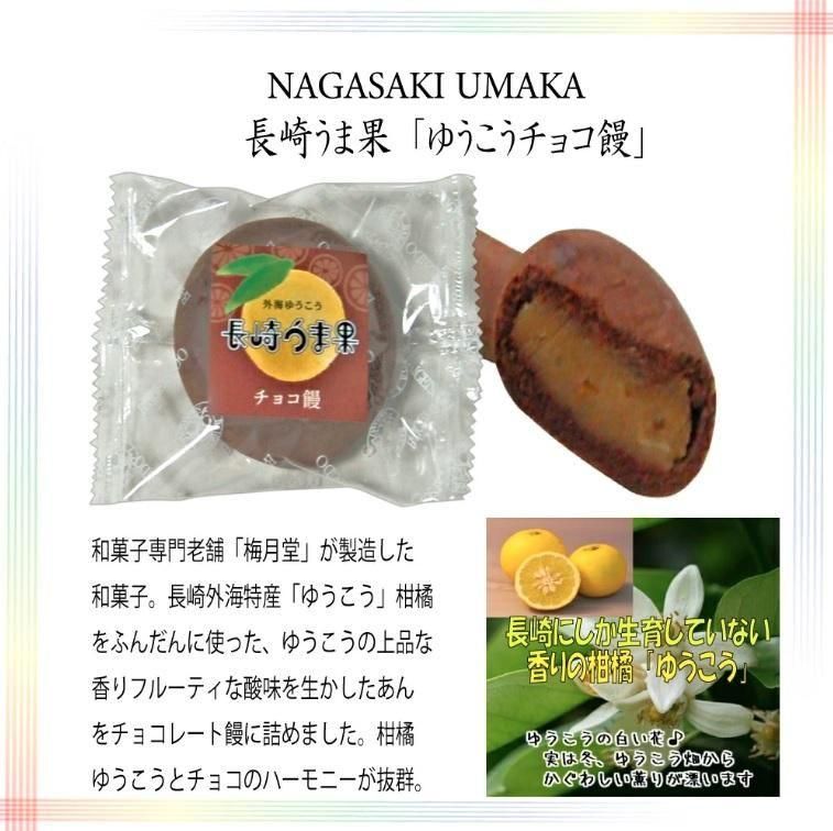 商品名:長崎うま果/チョコ饅 約30g 名称:和菓子 原材料名:白あん(生餡、砂糖)(国内製造)、卵、小麦粉、砂糖、ゆうこう果汁、ゆうこう果皮、バター、水あめ、カカオマス、ココアパウダー/甘味料(ソルビトール)、トレハロース、膨張剤、(一部に小麦・卵・乳成分を含む)