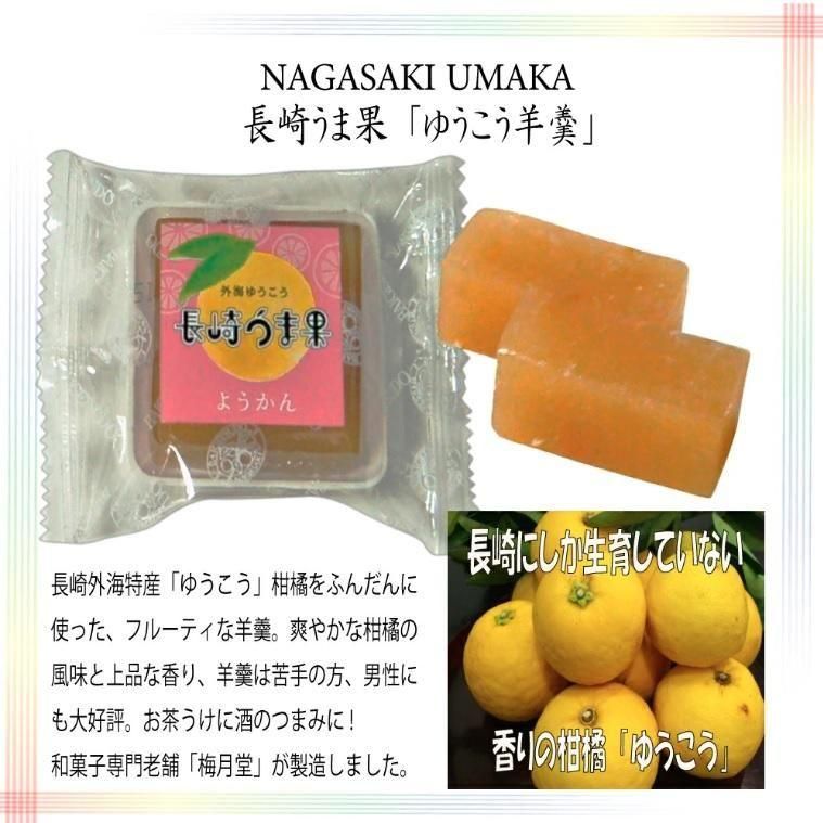商品名:長崎うま果/ようかん約60g 名称:和菓子 原材料名:白あん(生餡、砂糖)(国内製造)、グラニュー糖、ゆうこう果汁、ゆうこう果皮、寒天/トレハロース、甘味料(ソルビトール)